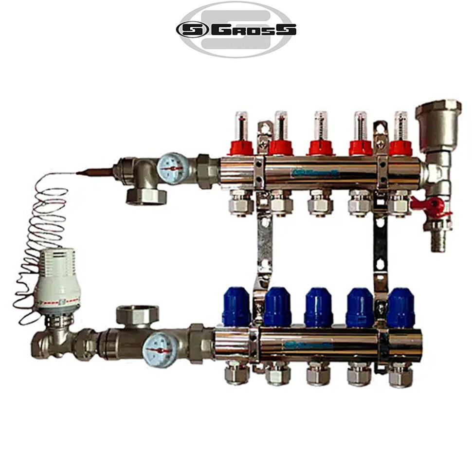 Розподільний колекторний вузол GROSS використовують для регулювання подачі теплоносія в системах та підлогового опалення. Трубопровід кожного з контурів радіаторного або опалення підлоги підключають до окремої пари приєднувальних штуцерів розподільника, що дає можливість регулювати витрату теплоносія, а, відповідно, і теплову потужність системи в кожному приміщенні будівлі індивідуально.