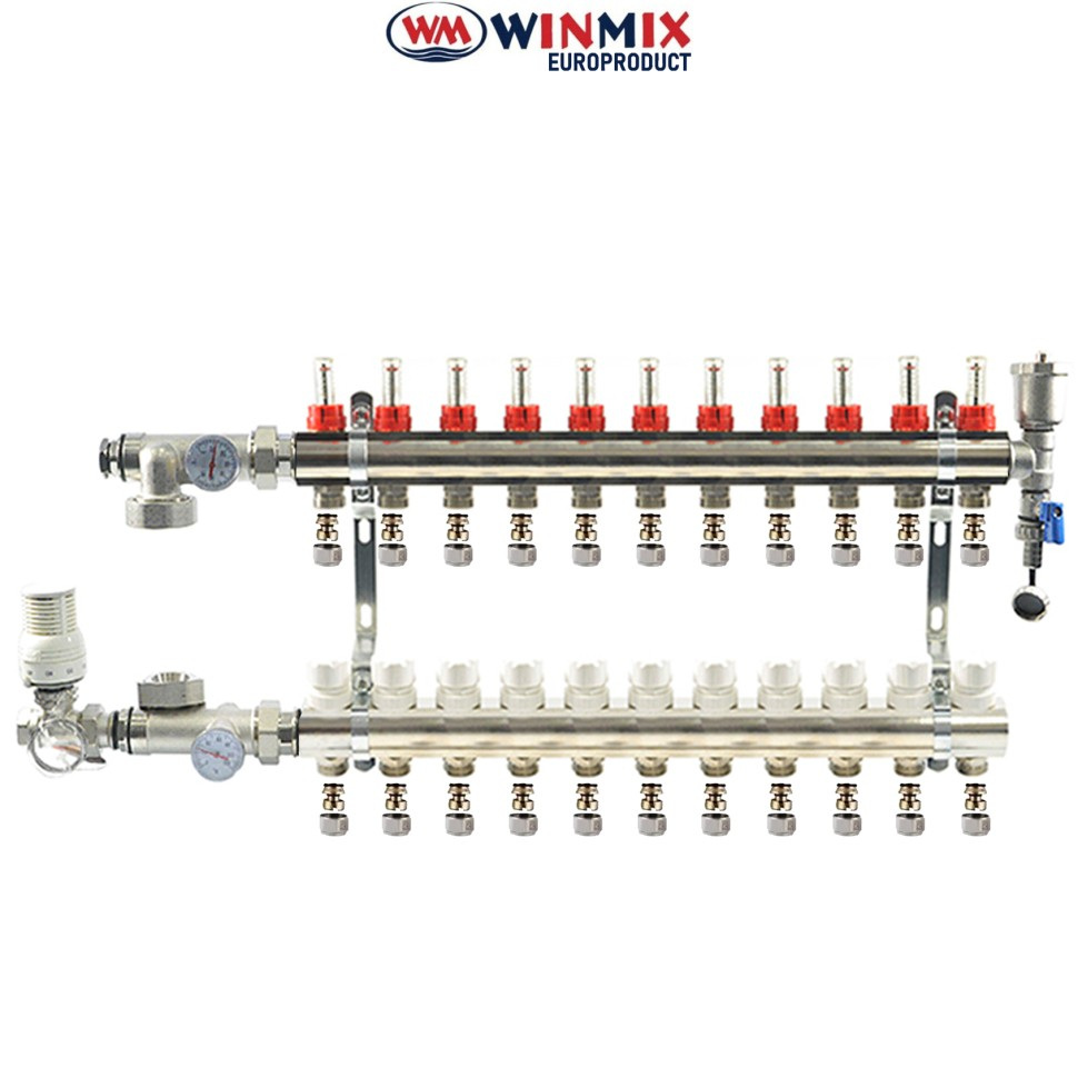 Колекторний вузол у зборі Winmix EUROPRODUCT для системи "ТЕПЛА ПІДЛОГА" з витратомірами, коннекторною групою, зливною групою, краном з термоголовкою 11 виходів.