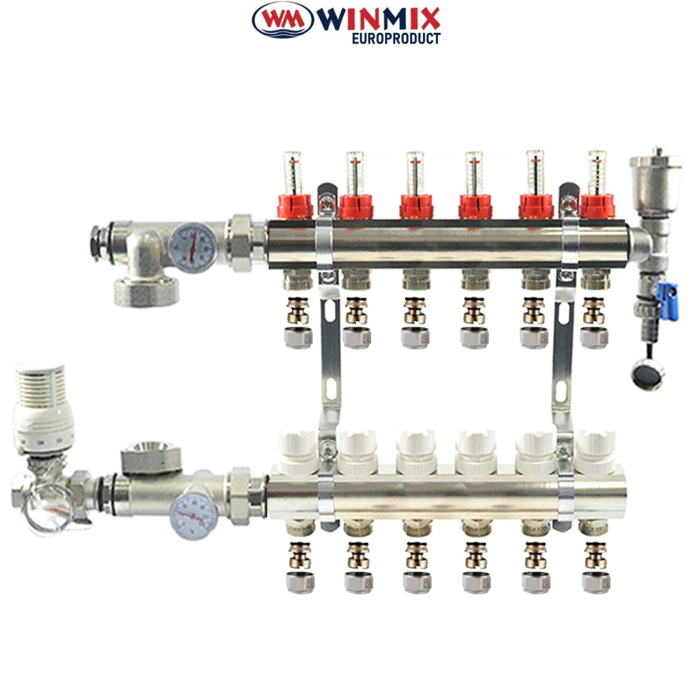 Колекторний вузол у зборі Winmix EUROPRODUCT для системи "ТЕПЛА ПІДЛОГА" з витратомірами, коннекторною групою, зливною групою, краном з термоголовкою 6 виходів.
