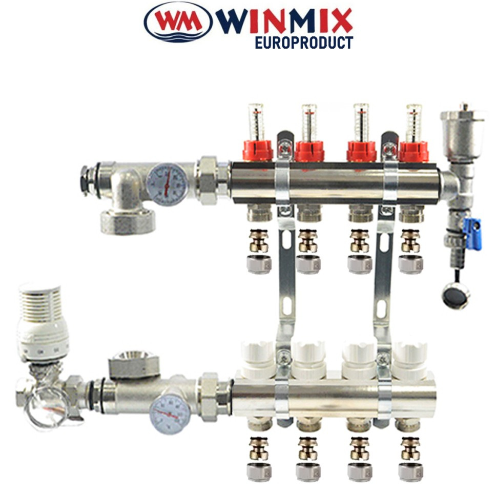 Колекторний вузол у зборі Winmix EUROPRODUCT для системи "ТЕПЛА ПІДЛОГА" з витратомірами, коннекторною групою, зливною групою, краном з термоголовкоюна4 виходи.