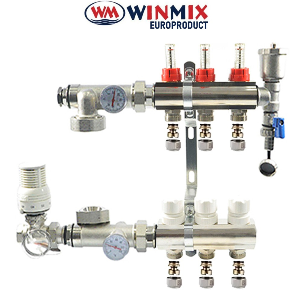 Колекторний вузол у зборі Winmix EUROPRODUCT для системи "ТЕПЛА ПІДЛОГА" з витратомірами, коннекторною групою, зливною групою, краном з термоголовкоюна3 виходи.