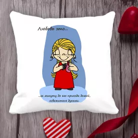 Подушка с принтом Love is "Любовь это... за минуту до его прихода домой, освежиться духами" Белый Кавун П000085