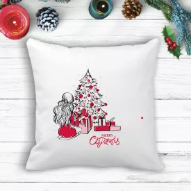 Подушка с новогодним принтом Девушка у елки с подарками "Merry Cristmas" Белый Кавун П003575