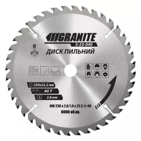 Диск пильный для дерева с твердосплавными напайками GRANITE 230х22.2х40Т 8000 об/мин (5-23-040)