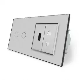 Сенсорный проходной выключатель 2 сенсора 1 розетка 1 USB серый стекло Livolo (VL-C702S/C7USBC1A-15)