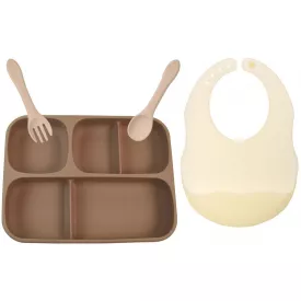 Набор силиконовая тарелка трёх-секционная слюнявчик ложка вилка 2Life Y25 4 шт Оранжевый (vol-9909)