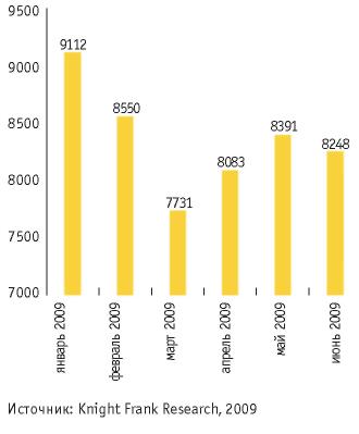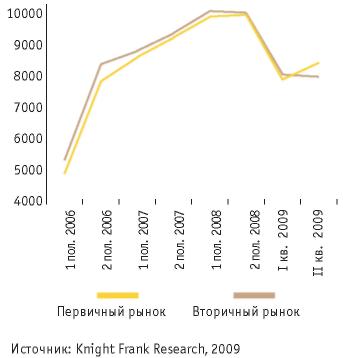 В первом полугодии 2009 года средние цены вторичного рынка элитного жилья составляли 7849 $/м2, при этом по отношению ко второму полугодию 2008 года произошло снижение на 21%.