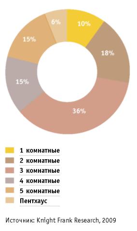 Структура предложения первичной элитной жилой недвижимости по количеству комнат на первое полугодие 2009 года, % от количества квартир