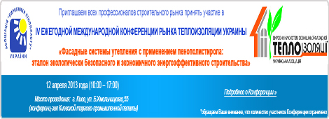 12 квітня 2013 року в конференц-залі Київської торгово-промислової палати (вул. Богдана Хмельницького, 55) пройде IV Щорічна міжнародна конференція: «Фасадні системи утеплення із застосуванням пінополістиролу: еталон екологічно безпечного і економічного енергоефективного будівництва».