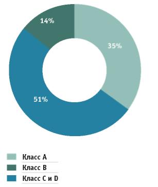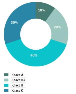 На 1 июля 2009 года структура предложения профессиональной офисной недвижимости выглядит следующим образом: класс А - 15%, класс В+ - 31% и В- – 54%.
