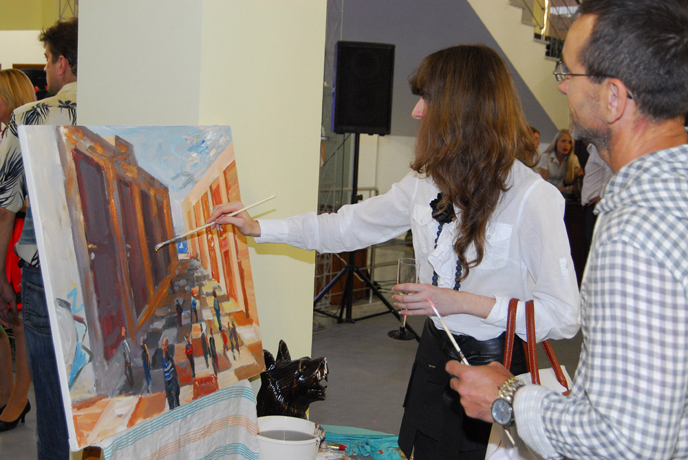 Пока гости слушали выступление артистов, невдалеке от сцены был установлен мольберт и желающие могли попробовать свои силы в живописи и поучаствовать в создании полотна, на котором долгие ряды дверей уходили за горизонт. Но наибольший интерес, пожалуй, вызвали конкурсы и лотереи, проведенные пред сценой. Призы были нешуточные – начиная от ноутбука и сертификата на 5 тыс. гривен и заканчивая пригласительными билетами на мастер-классы по бильярду от клуба «Шарпей».