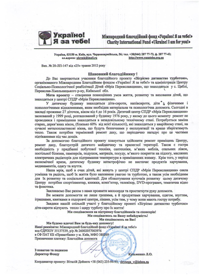 Звернення про допомогу Міжнародного Благодійного фонду "Україно! Я за тебе! "
