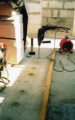 У іншій частині будинку готується опалубка залізобетонного перекриття. Після укладання арматури перекриття бетонується. У залізобетонному перекритті майбутнього санвузла передбачені отвори для пропуску труб.