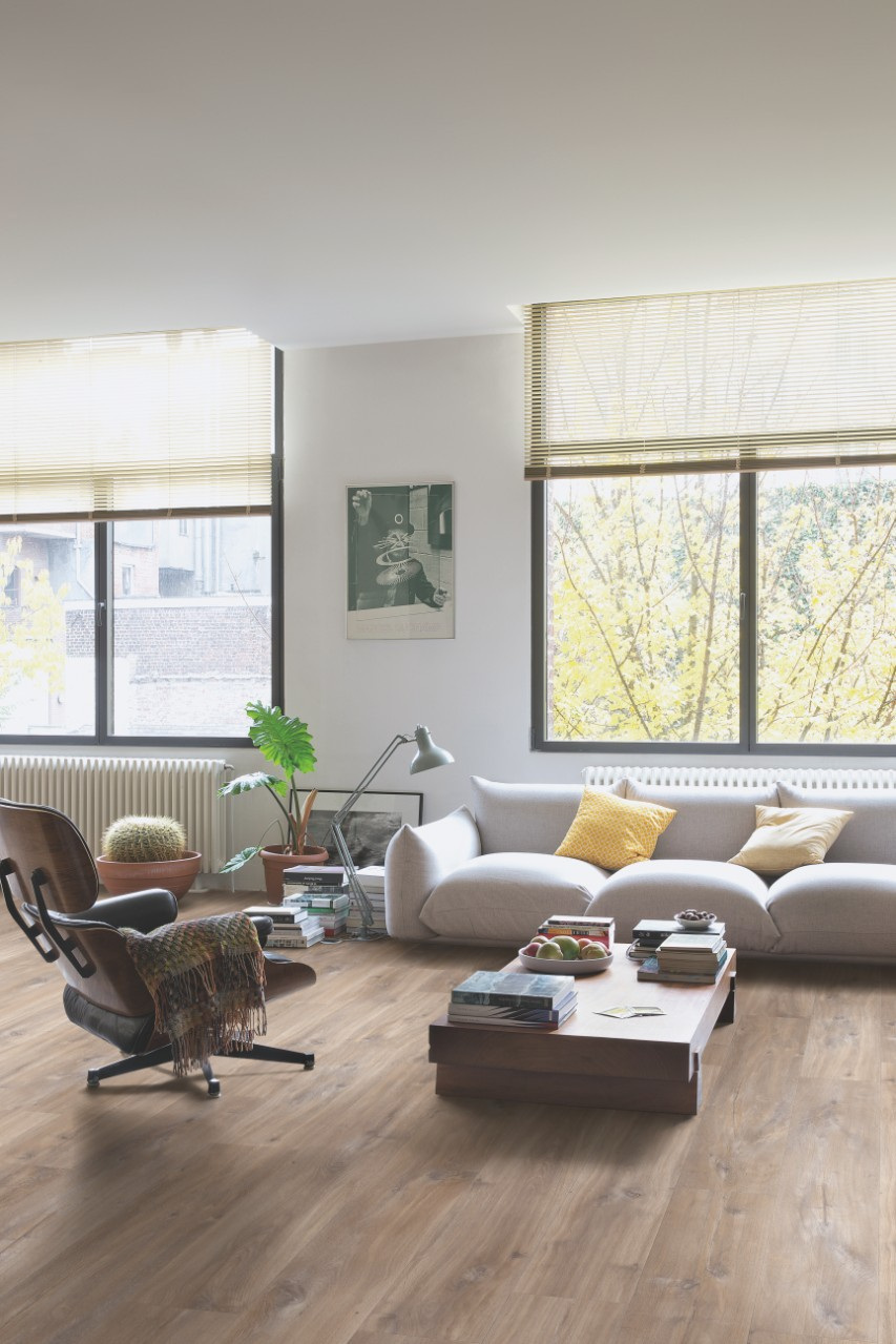 Лінійка Quick-Step Livyn — це колекція розкішних вінілових підлог, які не відрізнити від натуральної деревини, при цьому вони володіють найкращими властивостями вінілової плитки.Balance Click Plus - колекція міцних моделей водостійких підлог з запатентованою технологією замикання Uniclic Multifit для швидкої і простої установки. Вимагають рівну поверхню для укладання.Панелі з V-подібними канавками створюють просторову перспективу і підсилюють ефект дощатої підлоги.