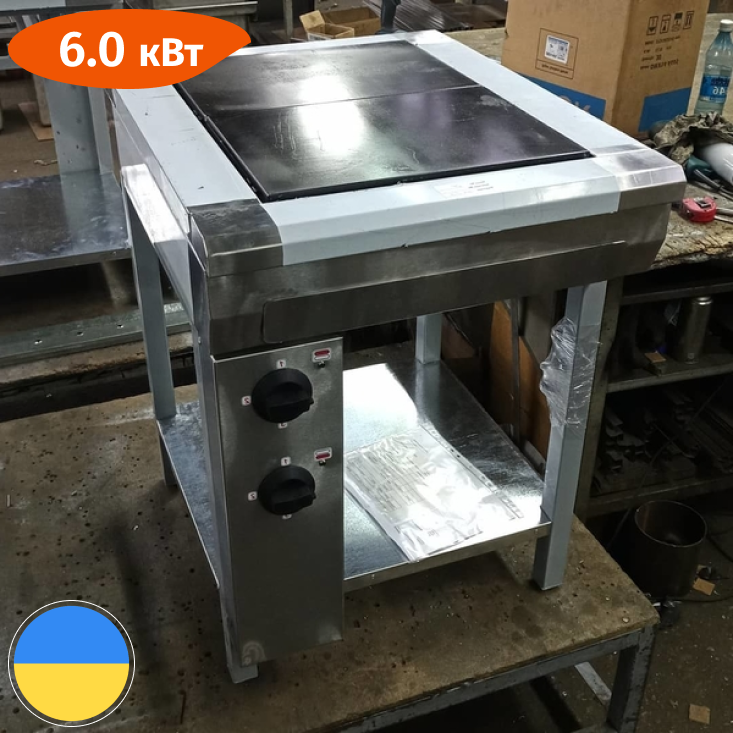 Промислова електроплита має механічну систему управління, її потужність становить 6.0 кВт. Використовується на професійних кухнях закладів громадського харчування.