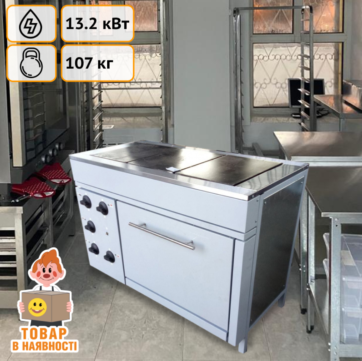 Призначення електроплити кухонної – приготування м`ясних, овочевих та різних типів страв на професійній кухні закладів громадського харчування. Важить 107 кг.