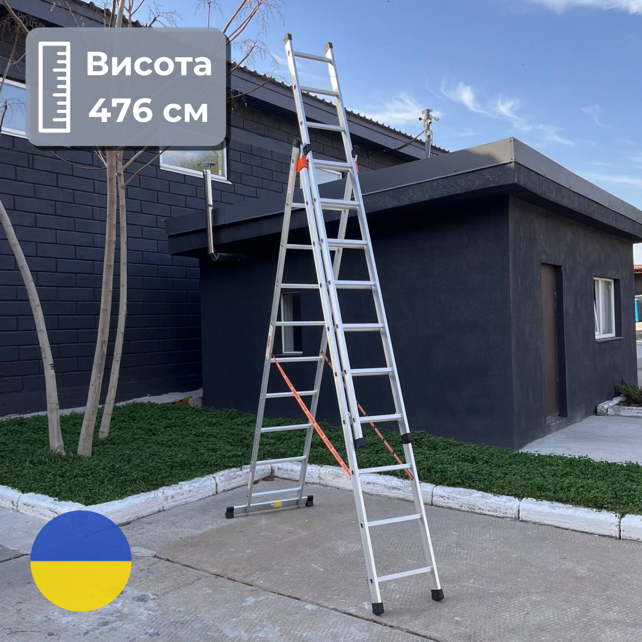Універсальна трисекційна драбина 6 м 3 х 10 сходинок — міцна і безпечна конструкція, використовується для різних будівельних робіт.