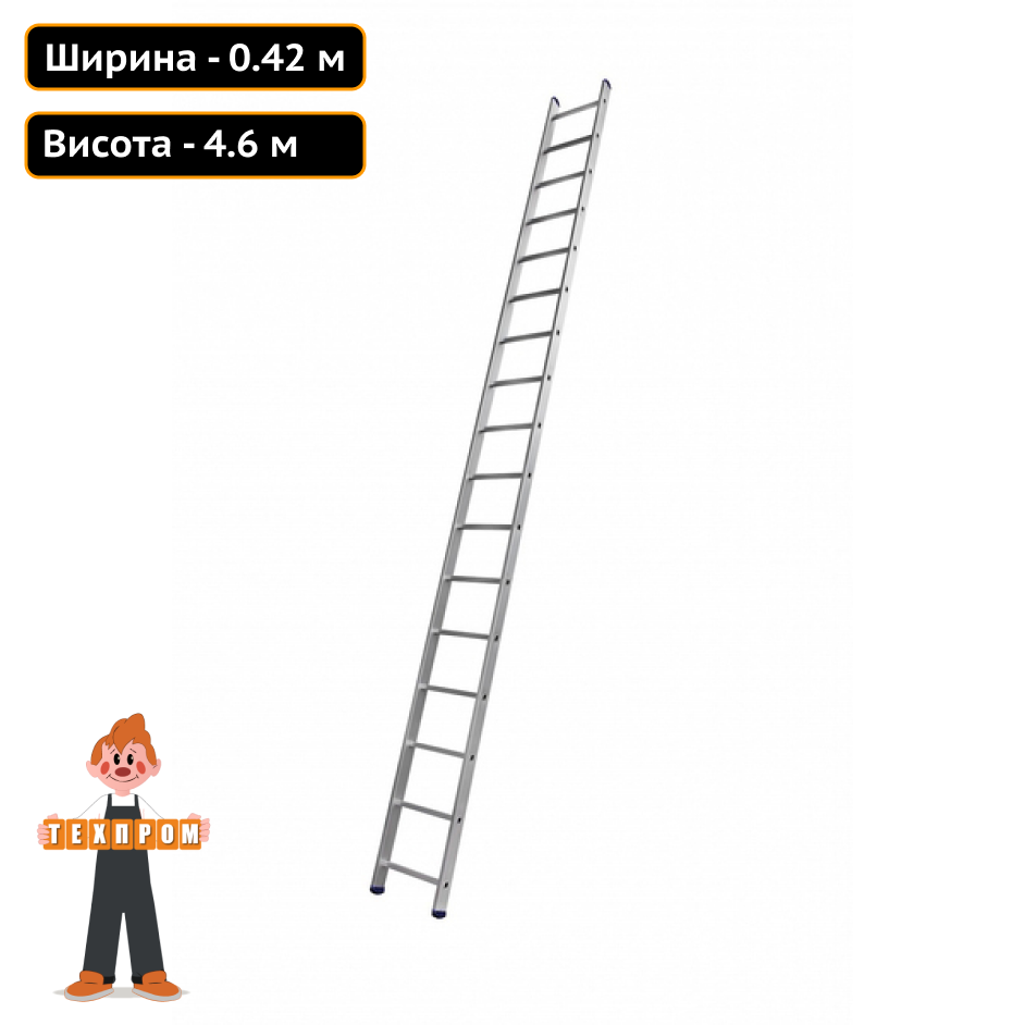 Односекційна драбина на 16 сходинок - це незамінний інструмент для ремонтних і будівельних робіт, її висота - 4.64 м, а ширина - 0.42 м.