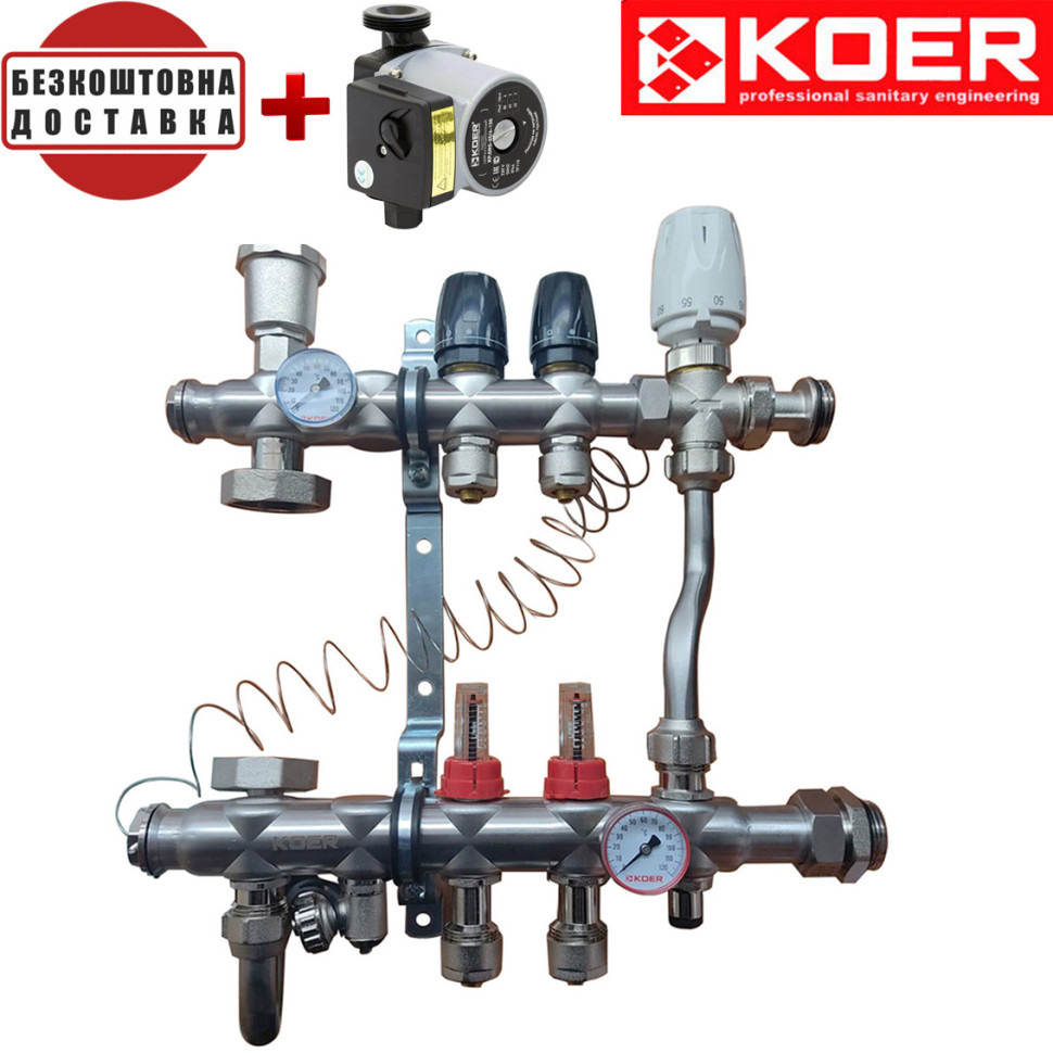 Основне завдання колектора для теплої підлоги KOER – змішування та перерозподіл потоків теплоносія. Залежно від кількості теплових контурів та площі приміщення, колектори можуть мати різну кількість необхідних для підключення висновків.