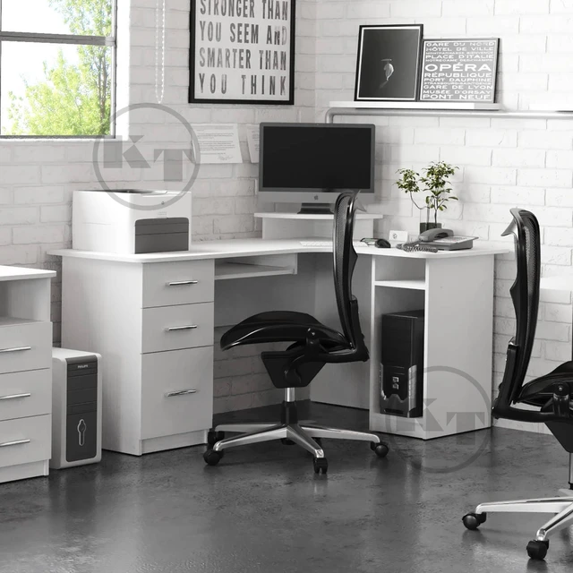 Кутовий письмовий стіл Компаніт СУ-3 використовується для роботи в офісі за комп'ютером, також його можна доповнити іншими корпусними меблями, створюючи свій інтер'єр кімнати.