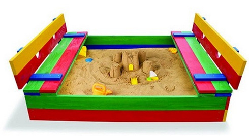 кольорова, з двома лавочки на краях, які трансформуються як кришка для квадратної пісочниці.