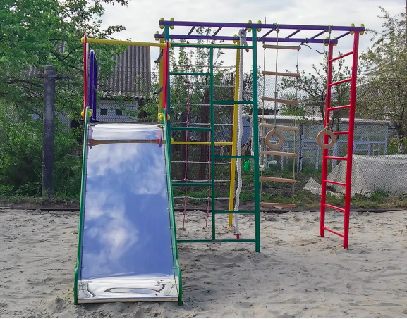 спортивний майданчик для дітей – використовується на вулиці для ігор малюків до 12 років. Це стандартний готовий вуличний комплекс для дитячих майданчиків біля будинку, у дитячому садочку.