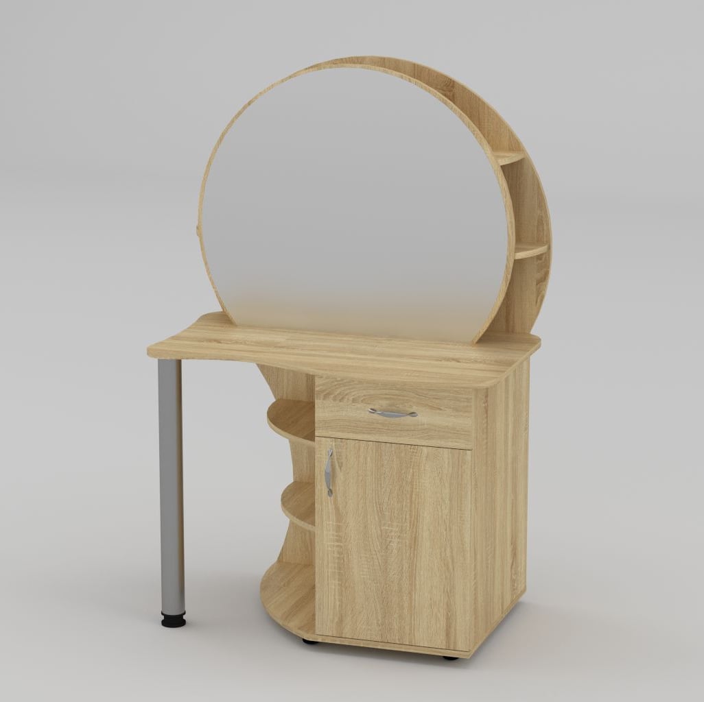 Дзеркало овальної форми закріплене на столику, столик має праворуч внизу ящик-тумбочку за двостулковою дверцятами та висувний ящик для косметичних засобів, а також дві відкриті полички — на які зручно поставити сумочки дамські.