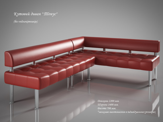 Офісний диван "Тонус" - модель без трансформації, прямокутної форми, позбавлена пафосу і помітних елементів - надійний і практичний м'який диванчик для відвідувачів. Вартість вказана в матеріалі шкірозамінника - Родео (є варіанти глянцевою оббивки - Флай або Неаполь).