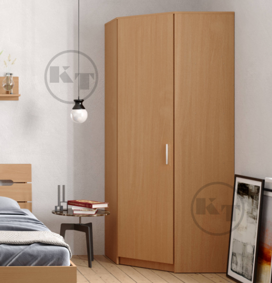 имеет форму трапеции, по центру одна распашная дверька, а внутри шкафа – штанга для вешалок с верхней одеждой и справа пять полочек для белья или легких вещей.
