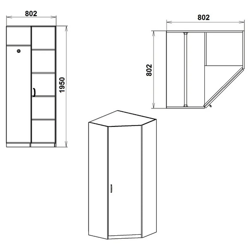 Высота углового распашного шкафа – 1950 мм, общая ширина – 802 мм.