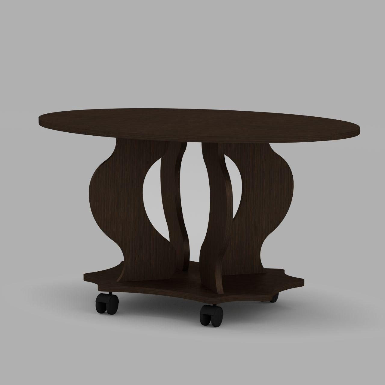 Овальний журнальний столик Компаніт Венеція вразить і приверне до себе будь-якого, хто хоче обставити своє житло або офіс цікавою ергономічної меблями. Виріб на коліщатках, фігурні ніжки фиксирют стільницю і нижню поличку.