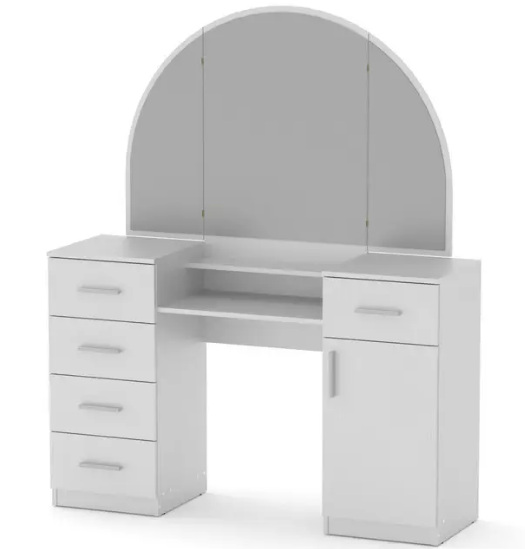 имеет большое овальное зеркало, состоящее из трех распашных частей, по краям стола имеются тумбочки - слева с с четырьмя выдвижными ящиками, а справа - внутренние полочки за распашной дверькой. Туалетный косметический столик Трюмо-5 Компанит применяют в спальне для девушек для макияжа и хранения косметики или как гримерный столик визажиста.