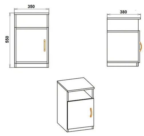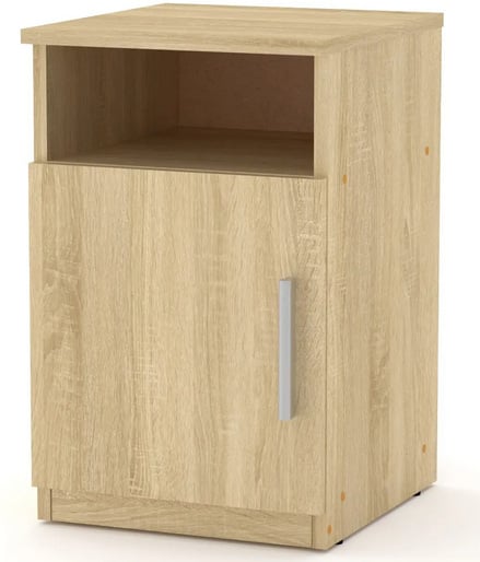 має простий дизайн прямокутної форми та займає мало місця в спальні біля ліжка. Тумбочка має відкриту верхню нішу та відділення з двостулковими дверцятами.