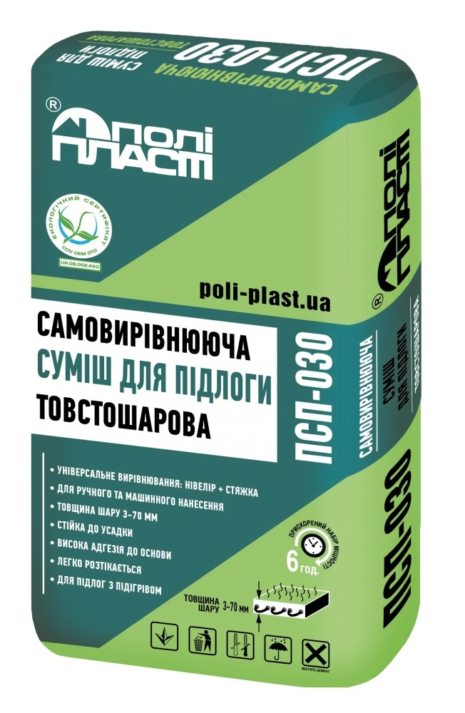 Характеристики товару Смесь самовыравнивающаяся толстослойная ПОЛИПЛАСТ ПСП-030 25 кг