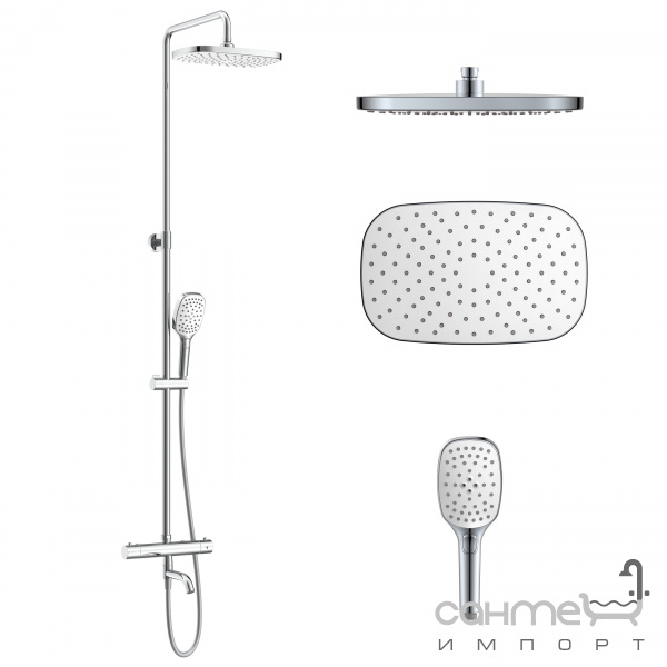Комплектація | лійка ручного душу, стійка, шланг, лійка верхнього душу, термостат |
