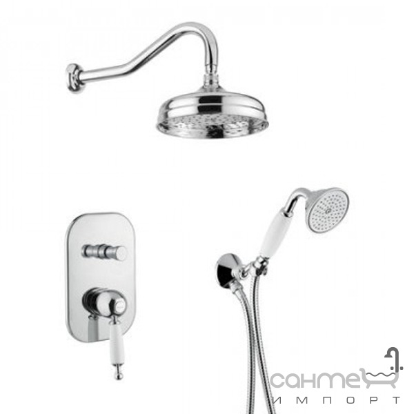 Комплектація | змішувач, тримач лійки, лійка ручного душу, шланг, лійка верхнього душу |