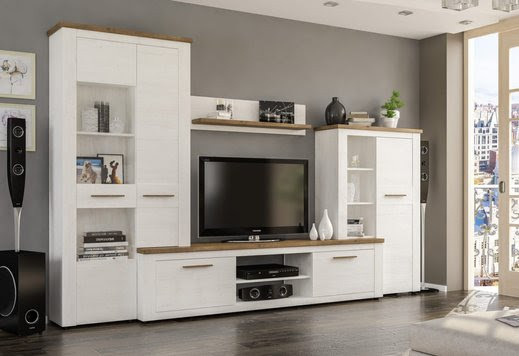 Центральну частину займає тумба для ТБ із двома відкритими поличками під стільницею в центрі та двома закритими тумбочками по обидва боки від них.