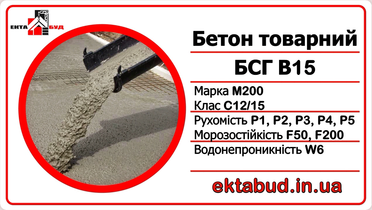 Характеристики товару Бетон товарний БСГ В15 М200 С12/15 Р1 F50