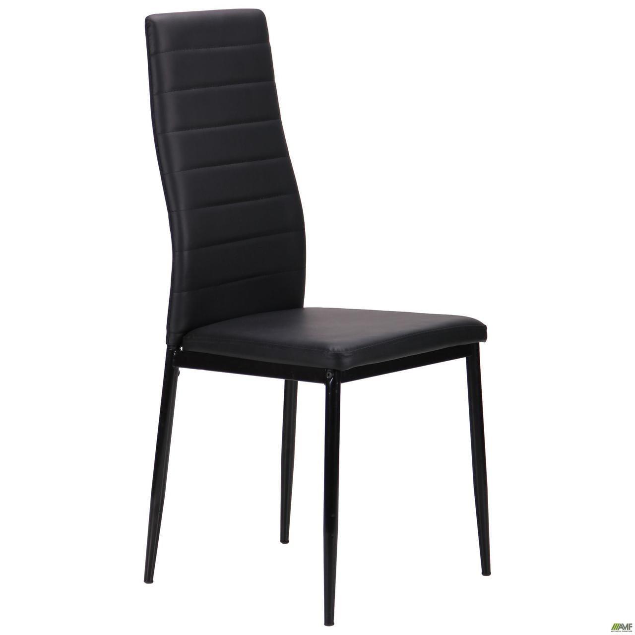 виконаний в металевому каркасі - ніжки чорного кольору, а чорне сидіння із спинкою з вигином під хребет - м'яке зі шкірозамінника.