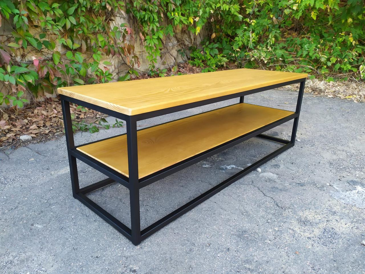 Тумба під телевізор металева у стилі Лофт GoodsMetall Т104. Каркас: Каркас зроблений з металевого профілю 20х20 із товщиною стінки 2 мм та має дві полиці, основна для телевізора або інших побутових товарів та додаткова. Завдяки металевому каркасу тумба дуже міцна та стійка. Полиці: Полиці виготовлені з натурального дерева. У стандартному варіанті дерево сосна, також можливі інші породи дерева (дуб, ясен, вільха). Фарбування: Каркас покритий якісною порошковою фарбою, яка стійка до подряпин та запобігає корозії. Колір каркасу – Чорний Мат, також можливий вибір інших кольорів. розміри: Висота – 420 мм Ширина/Довжина – 1200 мм Глибина – 400 мм Вага – 15 кг
