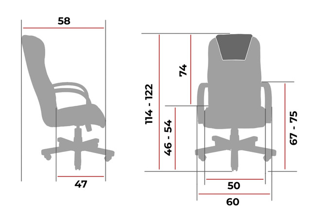 - Висота крісла зі спинкою в нижньому положенні — 114 см