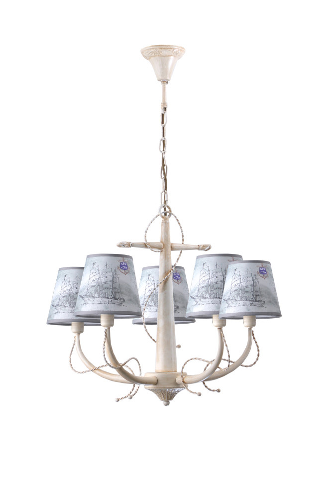 Класичний та елегантний дизайн: Каркас, виготовлений з металу та дерева в бежевому кольорі, надає люстрі вишуканий вигляд, а п'ять текстильних плафонів зі зображенням кораблів додають неперевершеного шарму та артистичності.