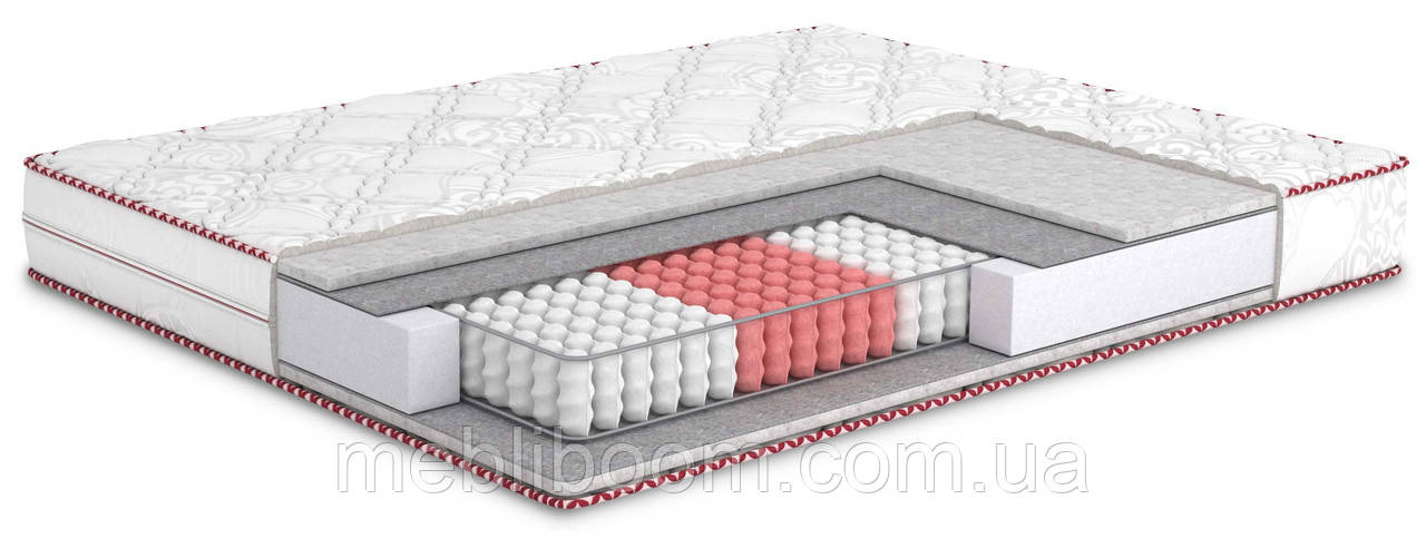Матрац Кармін з незалежними пружинами має яскраво виражений ортопедичний ефект. Він досягається завдяки грамотно розробленим внутрішнім наповненням. До складу даної моделі входять виключно екологічно чисті і безпечні матеріали, а саме: