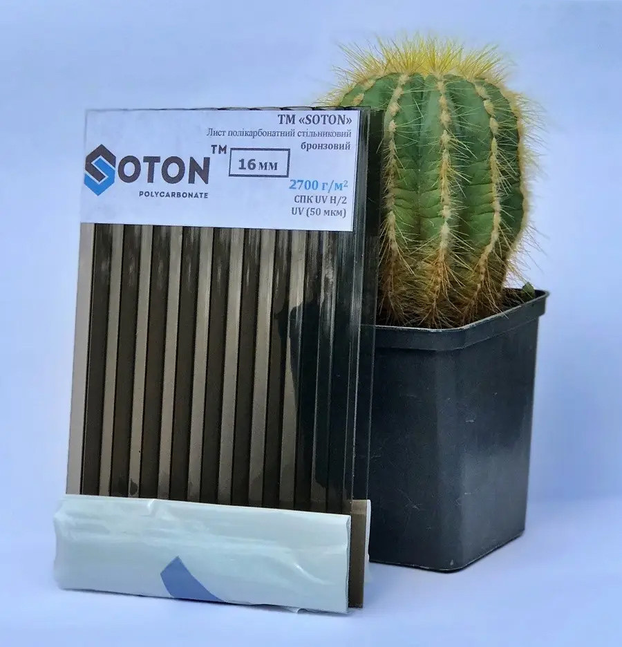 Завдяки сотовій структурі, він забезпечує відмінну теплоізоляцію та захист від ультрафіолетового випромінювання. Полікарбонат SOTON може бути використаний для покрівель, огорож, теплиць та інших конструкцій.