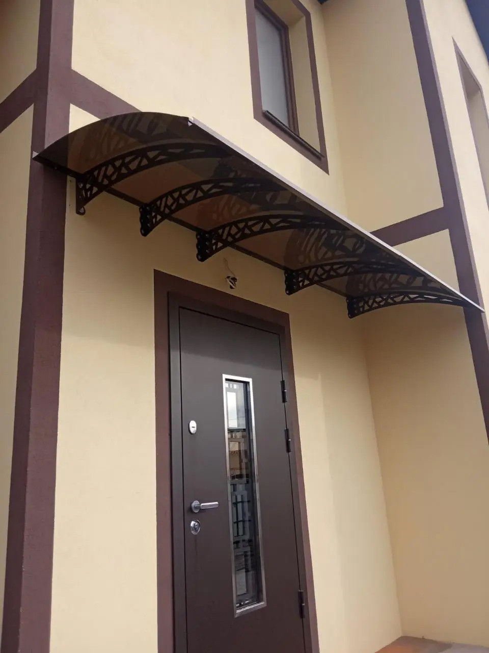 Виготовлений з високоякісного полікарбонату, цей навіс є міцним та стійким до ультрафіолетових променів, що забезпечує тривалий термін служби без вигорання або пошкоджень. Полікарбонат також має високу прозорість, дозволяючи достатньо природного світла проникати до входу.