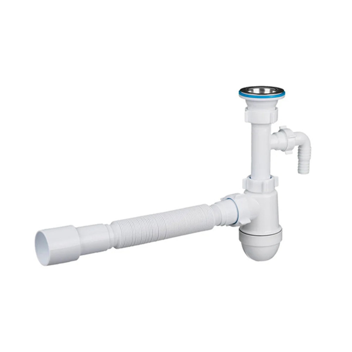 Сифон для кухни Ани-Пласт \"С 03 15\" 1 1/2\"x40 (разборная горловина) с отводом для стиральной машины с гибкой трубой 40x40/50 предназначен для установки с любой сантехнической арматурой. Благодаря наличию гибкой отводной трубы, сифон позволяет легко решить проблему отвода сточных вод в условиях ограниченного пространства. Вся сантехника имеет сертификаты качества и санитарно-гигиенические заключения.