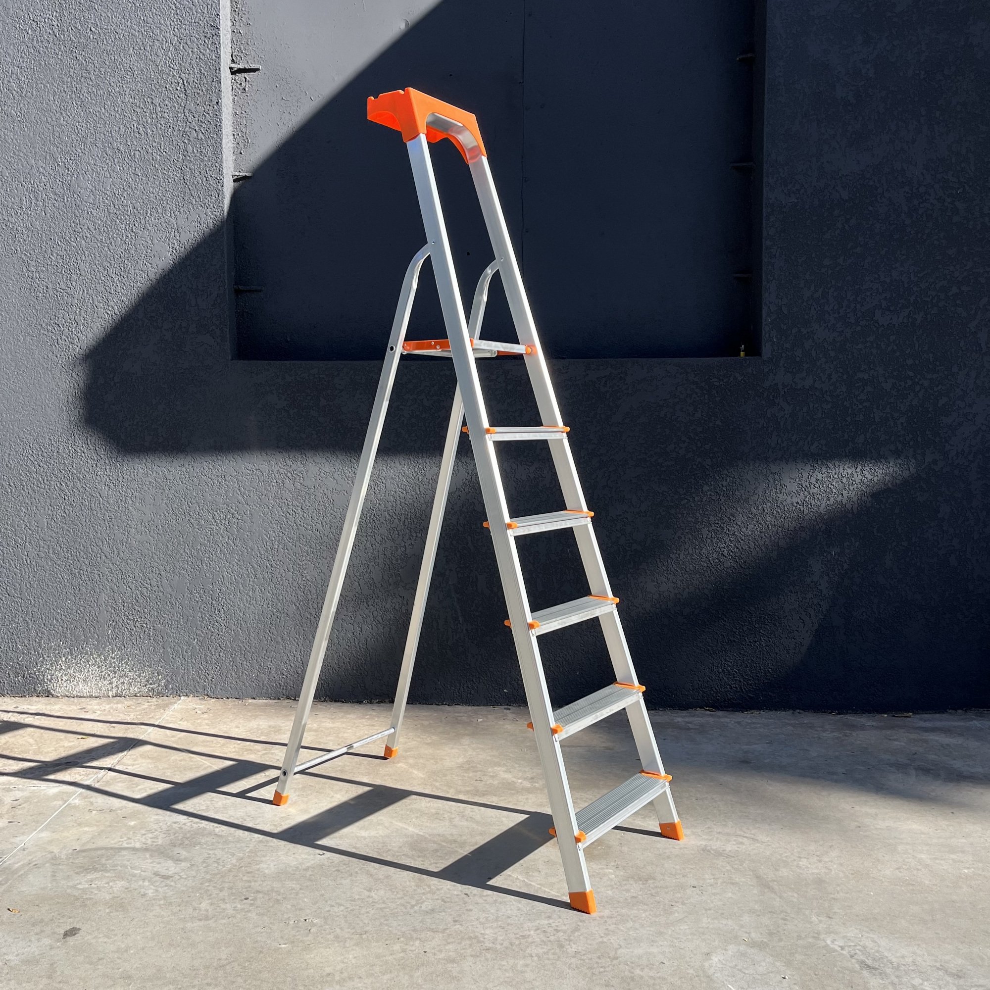 Драбина 1.8 м виготовлена із високоміцного алюмінієвого профілю і складається з двох частин, на одній з яких сходинки, а друга слугує опорою. Кількість сходинок - 6 шт.
