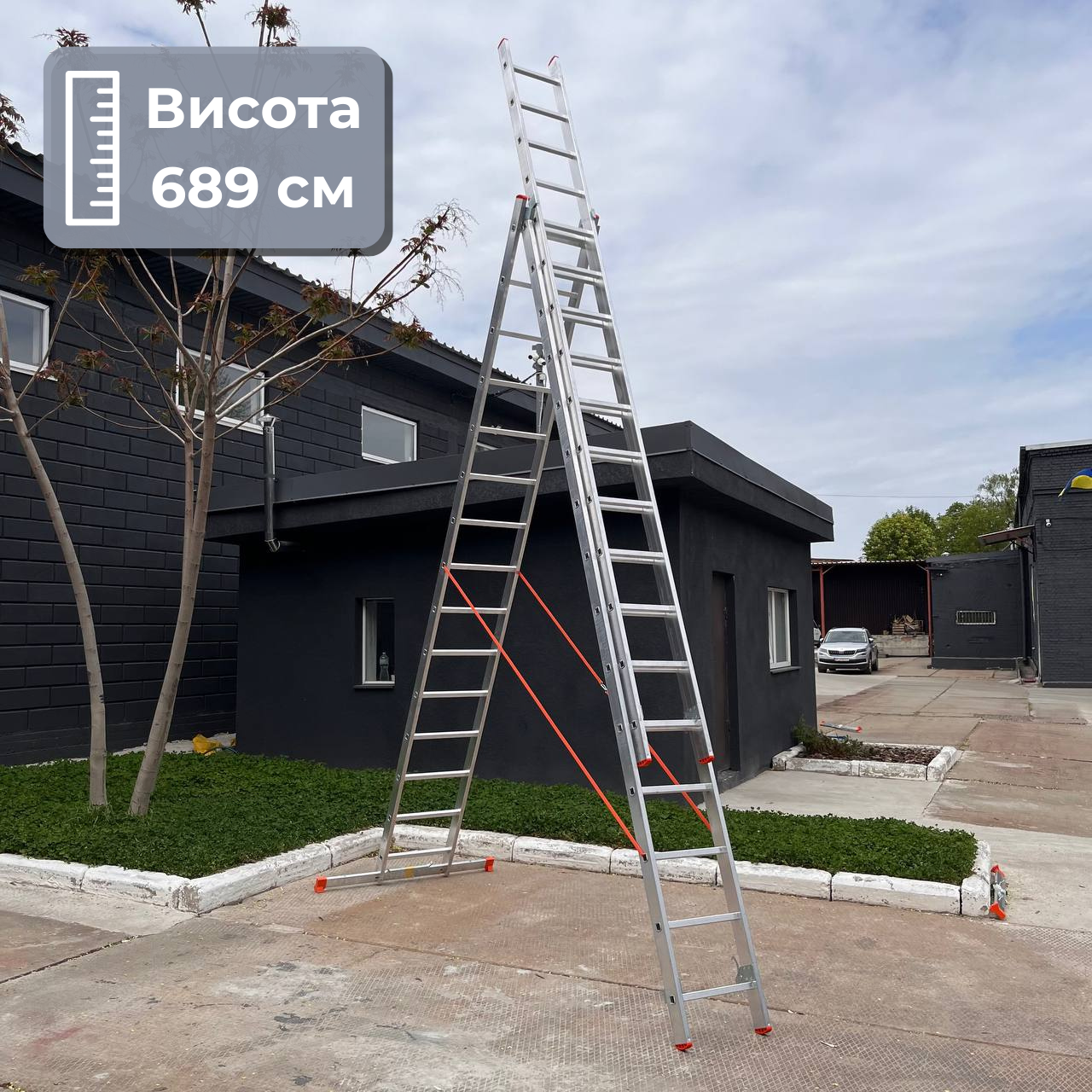 Трисекційна драбина 11 м 3 х 15 сходинок - багатофункціональний пристрій з алюмінію, допомагає здійснювати роботи на висоті до 11 метрів.