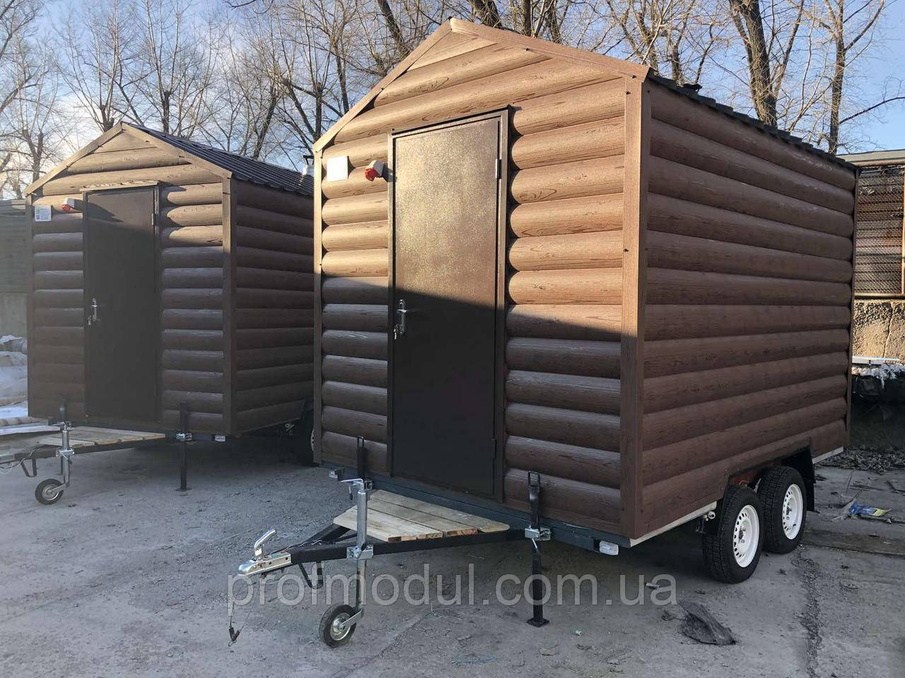 ТОВ "ПРОФМОДУЛЬ" виготовляє модульні конструкції різного типу використання. В тому числі і мобільні лазні. Зроблені вони на базі легкового двовісного причепа. Каркас лазні металевий зварний.Габаритний розмір 3200*2400 мм, висота 2600 мм.Утеплення 50 мм базальтової вати.Зовнішнє оздоблення - металевий сайдинг "фальш-брус". Вхідні двері металеві утеплені с замком.