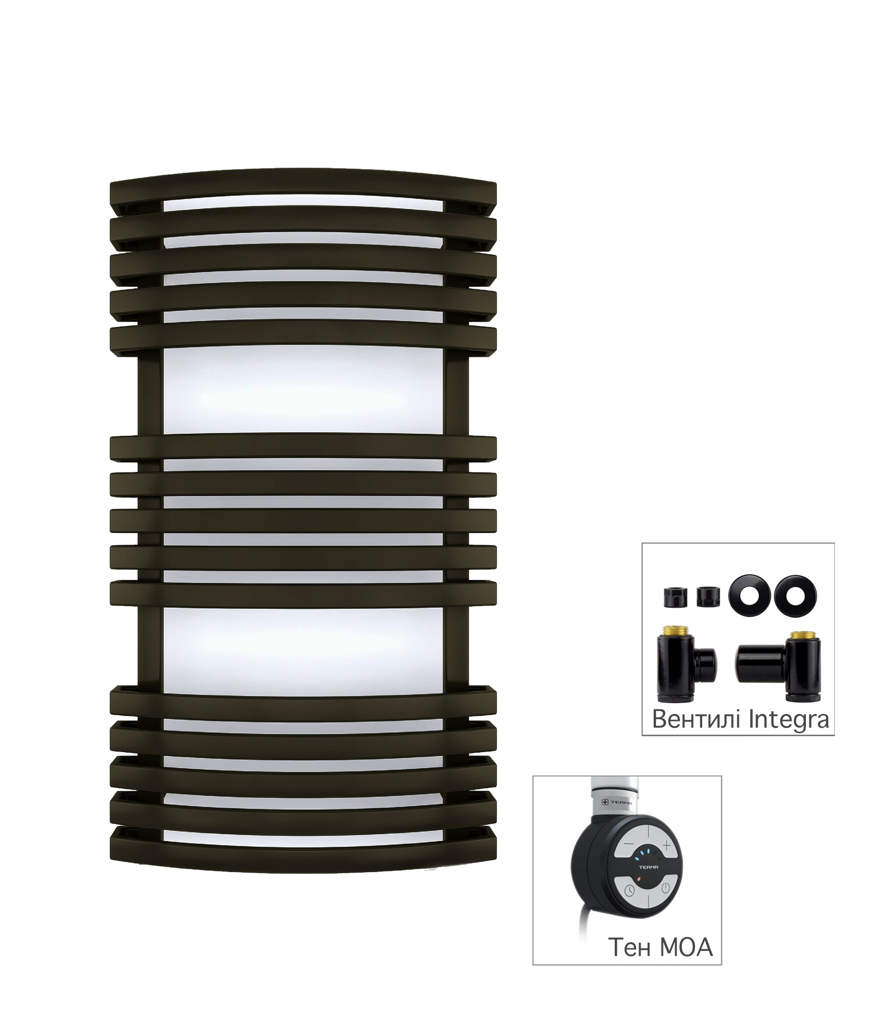 Опис Рушникосушка комбінована Terma Kioto 870x480 Black mat (9005 mat) тен MOA + вентиль Integra Black mat